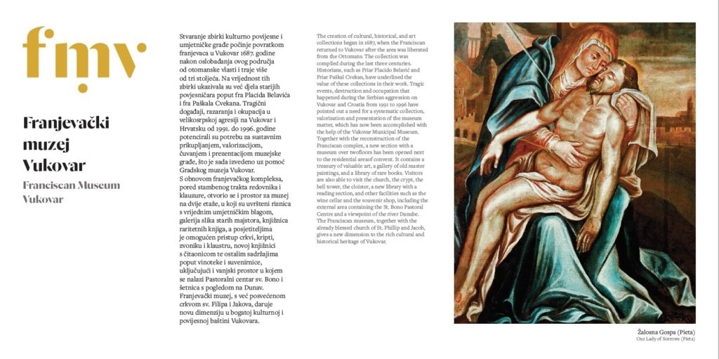 Besonders attraktiv und beeindruckend ist das kürzlich eröffnete Franziskanermuseum in Vukovar. Es zeugt vom reichen Kulturerbe der Stadt und erinnert an die jahrhundertelange Arbeit der Franziskaner in Vukovar, die sich nicht nur mit Glaubensfragen befassten, sondern auch mit Wissenschaft, Kultur und Geschichte. Ebenfalls erlaubt es das Museum nicht, dass all die vielen Menschen in Vergessenheit geraten, die das kulturelle Erbe Vukovars retteten und erneuerten. Eine Sonderstellung unter ihnen hat Bruder Marko Kurolt inne, dessen Verdienst es war, dass ein großer Anteil des Kunstschatzes, und vor allem des Bücherschatzes, im Dezember 1991 aus Vukovar in das Franziskanerkloster Zemun umgesiedelt wurde, von wo er im Jahr 2001 nach Vukovar zurückgebracht wurde, und nach der Restauration ist er den Museumsbesuchern wieder zugänglich.